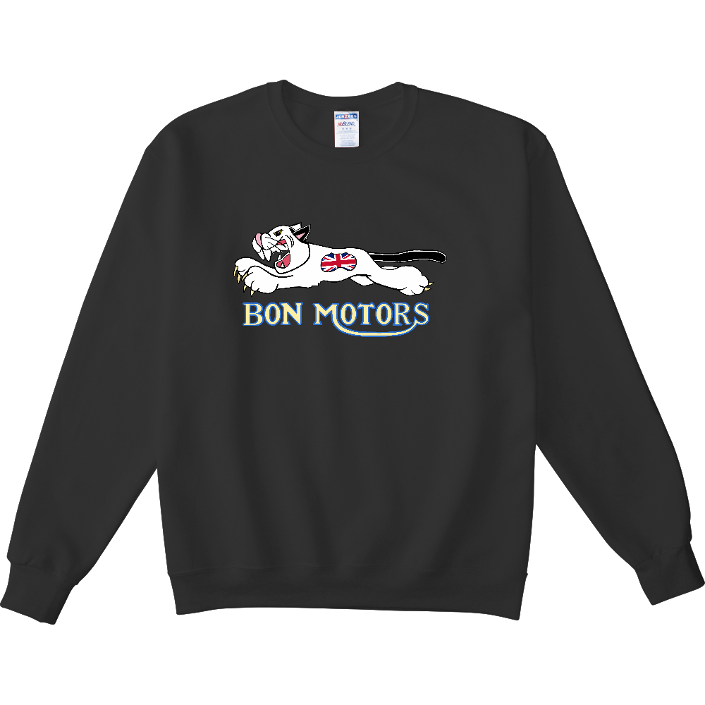 BON MOTORSのロゴと、猫(BON)のイラストがプリントされた裏毛起毛プルオーバー。BONの柄の形になったイギリス国旗もポイント。